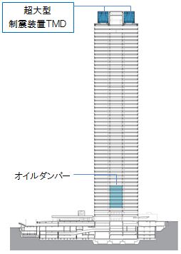 超大型制震装置TMDは、従来超高層ビルの風揺れ対策に屋上に設置されてきた振子式の錘(おもり)の技術を発展応用させ、日本初の超高層ビルの地震の揺れ対策の制震装置として、三井不動産および鹿島建設により実用化したものです。