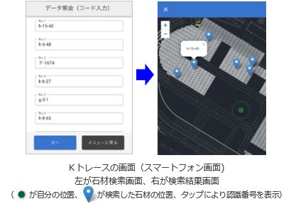 3箇所あるいずれかの仮置き場に石材を搬入し、石材の位置が確定したらKトレースを起動してGNSSによる測位※を行い、位置情報と個別情報とを紐付けて保存 - 使用石材の検索と選定