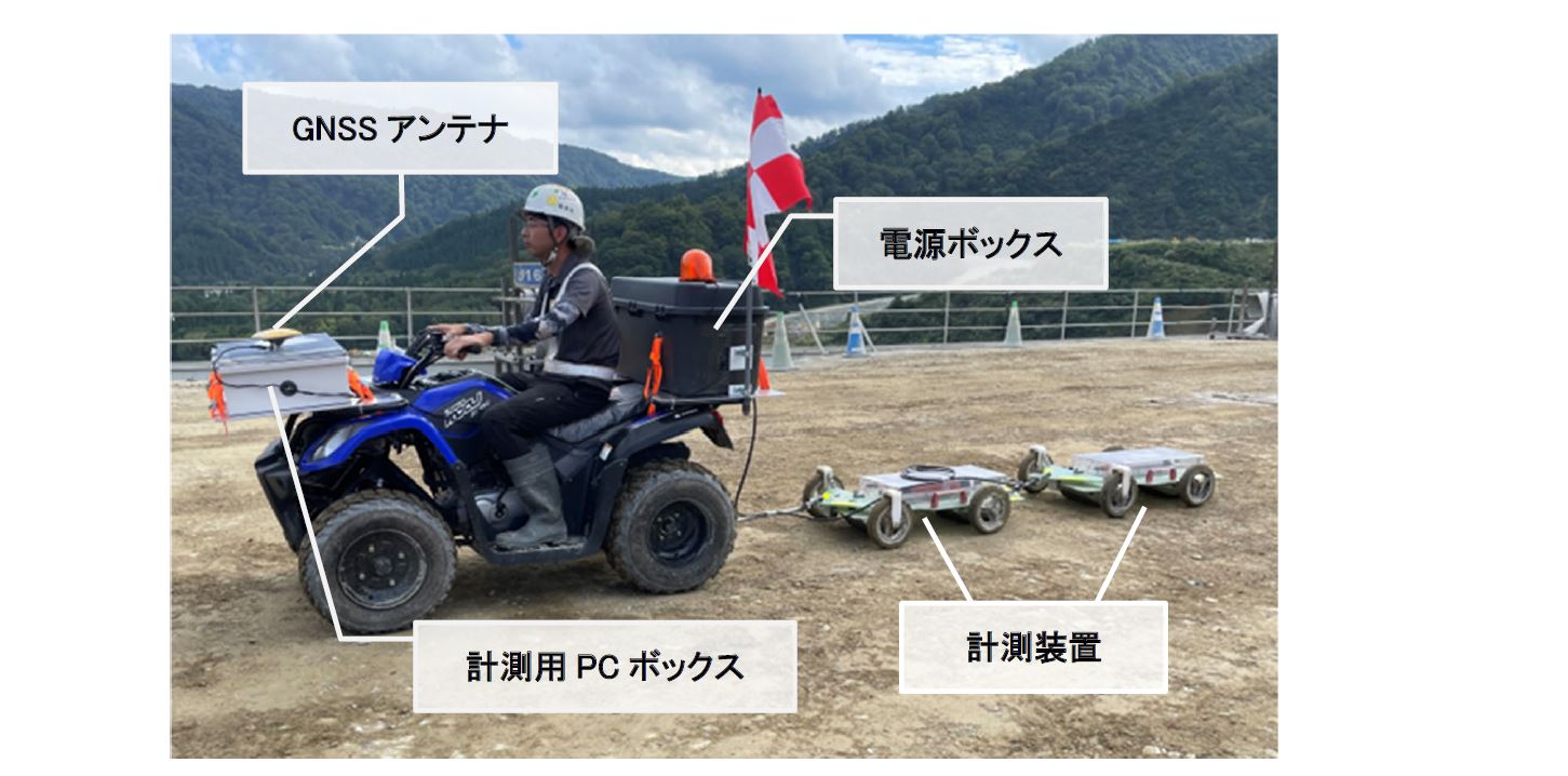本手法は、地盤の電気抵抗を利用し現場密度を算出するCSG等の締固め品質管理手法です。試験対象の地盤に4つの電極が取り付けられた計測装置を接地・牽引し、地盤の電気抵抗を連続計測、その結果を利用して現場密度を算出します。これにより、広域かつ面的なデータがリアルタイムに取得でき、施工面全域の締固め品質管理を実現しました。なお、計測深度は、電極間隔を変えることで自由に調整可能です。
