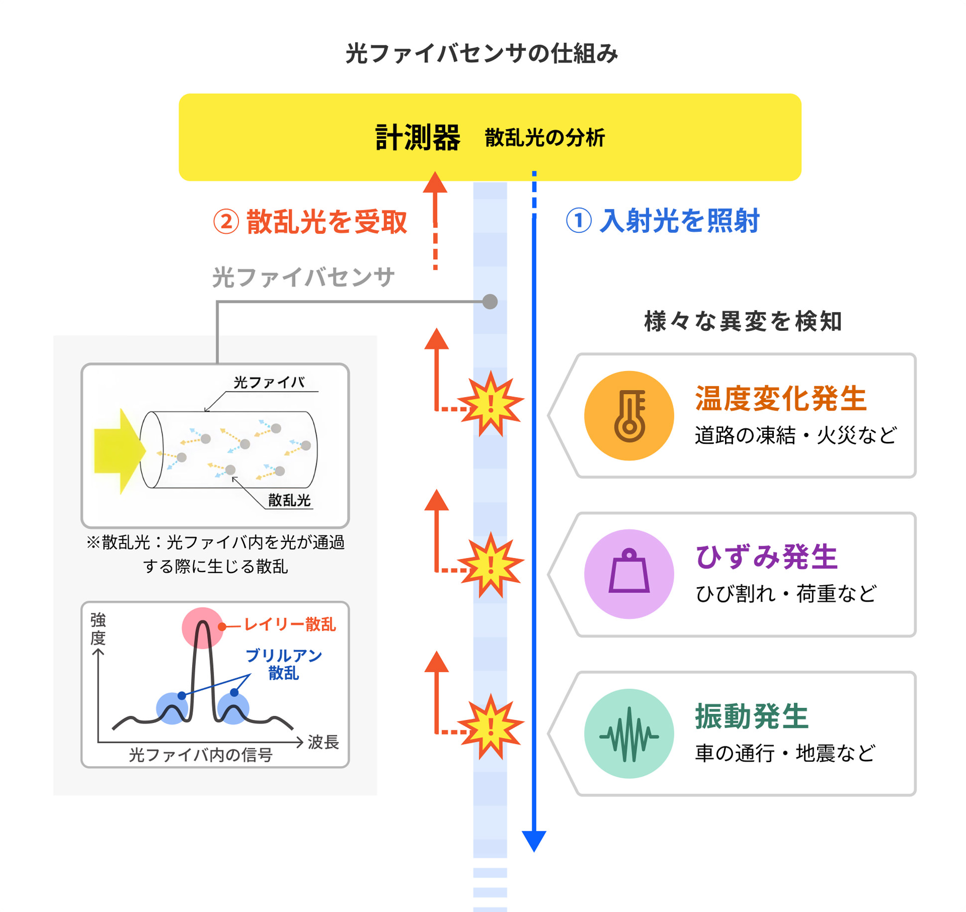 光ファイバセンシングの原理:光ファイバにレーザ光を入力すると、「レイリー散乱」と呼ばれる微弱な散乱光が生じ、反射光として戻ってきます。このレイリー散乱光のスペクトルは、ひずみによって変化する性質を持ち、ひずみセンサとして利用できます。