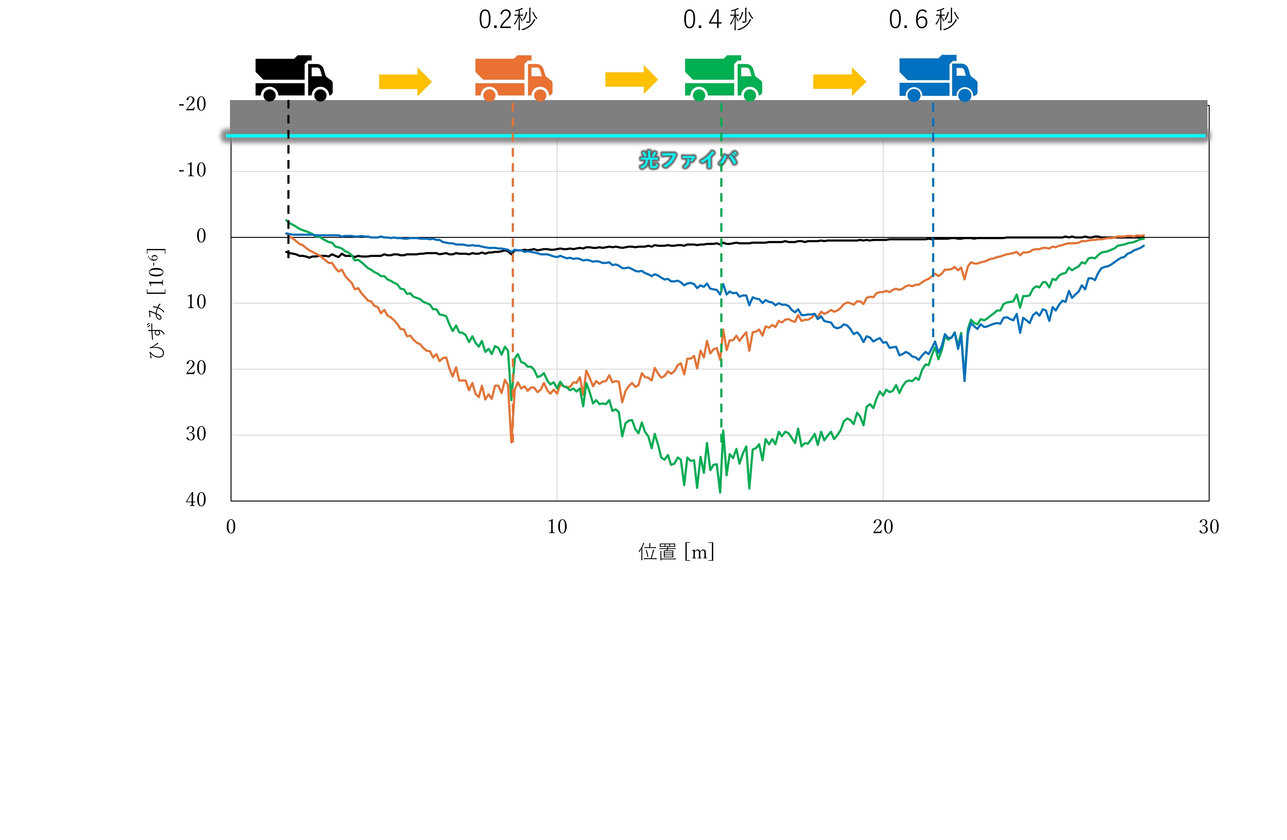 実際に橋の主桁下端面に光ファイバセンサを敷設し、大型車両走行中のひずみ応答を「SensRay」で計測しました。その結果、0.2秒間隔で動的にひずみが変化する様子を桁全体にわたって捉えることができ、車両の位置ごとに変化するひずみ応答を高速で計測する「動的計測」が可能であることが確認できました。