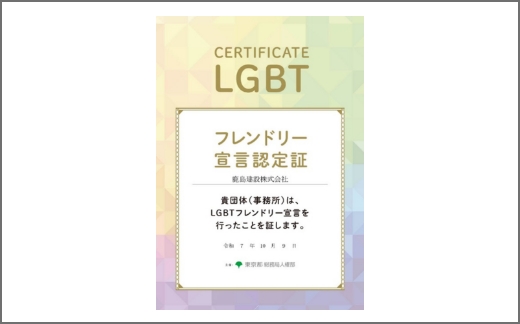 2025年10月、東京都より性的マイノリティの方々が働きやすい職場の環境づくり等に取り組む企業として「LGBTフレンドリー宣言認定証」を受領しました。