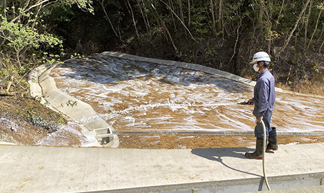 ハイドロシーダー、エンジンポンプ等を用いて、法面にMAK.シードを散布する。1~2日程度の養生期間で地盤表面に被膜が形成される。