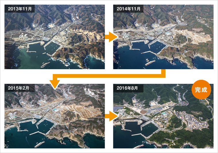 2013年6月から三王団地の造成工事が開始され、100万m3規模の土を動かす大規模な造成工事を行い、2015年秋に宅地が完成しました。区画整理事業区域の工事は2014年度から本格的に着手し、国道45号線の振り替え・新設工事と連携しながら宅地のかさ上げや公園・インフラなどの基盤整備を実施し、2016年夏頃の完成を目指しています。