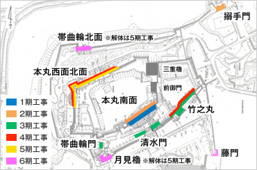 2017年7月から6期工事が開始されました。6期工事では、5期工事で解体工事が行われた帯曲輪北面と月見櫓の復旧工事が行われています。また、6期工事では、新たに藤門の解体工事並びに復旧工事が行われます。2018年3月の全体竣工に向けて工事を進めていきます。