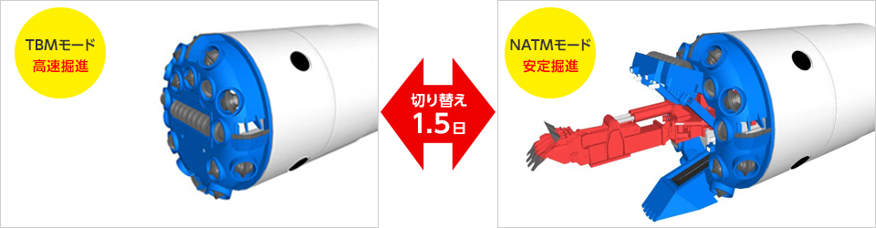 - 地質の変化に応じて、TBMモードからNATMモードへわずか1.5日で切り替えが可能