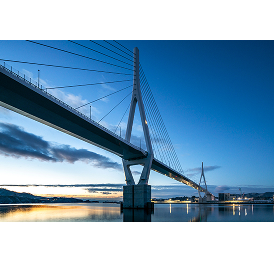 気仙沼湾を横断する「気仙沼湾横断橋」の下部工となる海中橋脚1基と、陸上部の橋台1基を築造する工事です。海中に橋脚を構築する三陸沿岸道路唯一の工事で、国内最大級の大きさを誇る橋脚は「トラス型支保工」を採用、一括架設を行いました。完成した気仙沼湾横断橋(愛称:かなえおおはし)は、東北地方最大の斜張橋であり、復興のシンボルともなっています。