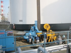 鋼矢板は、非液状化層に1.0m以上根入れします。タンク及び防油堤に囲まれた狭い場所でも、油圧圧入機を用いて鋼矢板を打設します。鋼矢板打設後、リング状に設置された鋼矢板の一体性を高めるため、矢板頭部には鉄筋コンクリート製の枕梁を設置します。配管等で鋼矢板を直接連結できない箇所では、隣接する鋼矢板間を接合鋼板で連結し、鋼矢板圧入の際に接合鋼板を順次継ぎ足していくことで、鋼矢板リングを構築することができます。