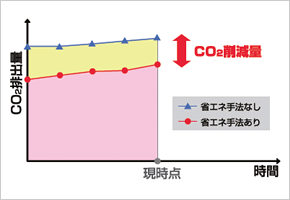 省エネシステムを運用する場合としない場合のCO2排出量をリアルタイムで比較し、即座にその削減効果の把握ができます。