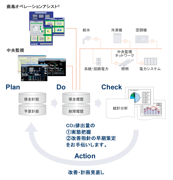 BEMSの進化形、鹿島オペレーションアシスト®は、お客様の施設における運転状況をリアルタイムで見える化し、設備機器の問題点の早期把握・運用改善を実現します。
