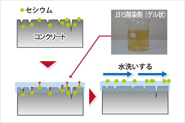 セシウムを溶かし出す薬剤をゲル状に加工してコンクリートの表面に塗り、間を置いてから洗い流す手法です。単純な高圧洗浄よりも飛躍的に効果が高まります。