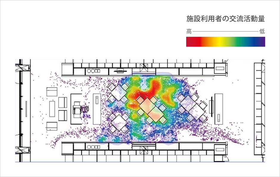オフィスの運用段階において、レーザーレーダーなどのセンサーを活用して居住者の空間利用状況の連続的なモニタリングを行います。計画時の利用想定との対比、利用実態に即した継続的な運用改善のサイクルを通して、働きやすいオフィスの提案や省エネ計画に繋げます。