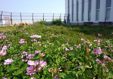 ビル屋上などにある水田は、防水層を痛めるリスクがあるため機械を用いる作業の実施が困難であり、また、稲の刈り株などのゴミの処理が課題となります。鹿島はNPO法人雨読晴耕村舎と連携し、不耕起稲作と呼ばれる栽培手法を採用しました。これにより、代掻きなどの耕転を必要とせず、また刈り株などの廃棄物が発生しない維持管理が可能となりました。冬期は緑肥としてレンゲを播種し、水田からの土の飛散を防止するとともに、昔懐かしい農村景観を再現しています。