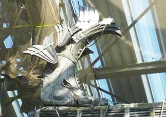 大天守の「鯱瓦(しゃちがわら)」修復のため、約50年ぶりに屋根から降ろしました。状態を調査したあと、修復がすすめられていきます。
