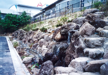 施工中に発生した岩石などの材料を用いた擁壁とせせらぎ