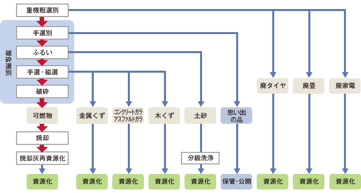 このような災害廃棄物は、以下のような処理を経て、可能な限り再資源化が図られます。