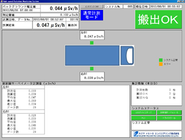 このシステムは、空間線量率計測器と計測対象物を検知する光電センサおよびデータを収集するパソコンなどで構成されています。ダンプトラックを計測するレーンでは車両を挟んで2台の計測器を、最大3個のコンテナが同時に運搬されるコンテナ車を計測するレーンでは、コンテナを挟んで6台の計測器を設置します。パソコンは計測レーンの横に設けたガードマンボックスの中に設置し、計測された空間線量率などのデータの蓄積や管理を行います。