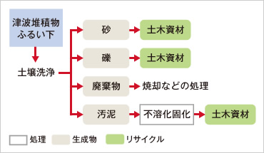 鹿島では、これらの津波堆積物と、ふるい下に集められる多量の廃棄物や有害物質を除去し、より良質な土木資材(洗浄砂、洗浄礫)を生成する分級洗浄※施設を開発しました。