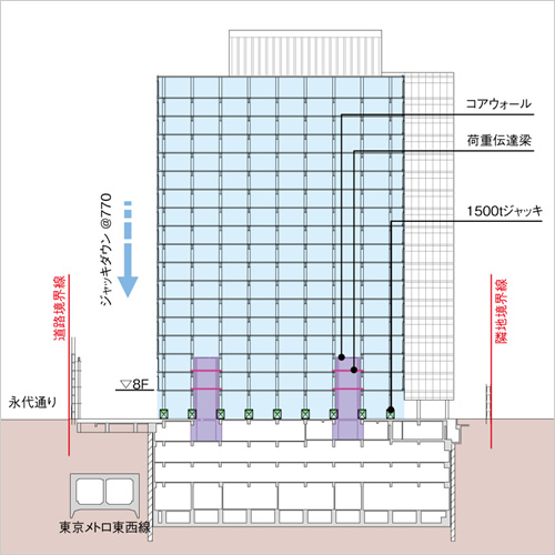 本工法はコアウォール(鉄筋コンクリート造の壁)と荷重伝達梁による耐震機構によって建物供用時と同様の耐震性を確保しています。コアウォールは、地震時に建物に働く水平力を荷重伝達梁を介して受け止めて基礎に伝達、コアウォールに縦に切られたスリット溝に荷重伝達梁が嵌合してスライドすることで、ジャッキダウン中や柱切断時など建物が上下に移動する時でも常に地震時の水平力を伝達できます。