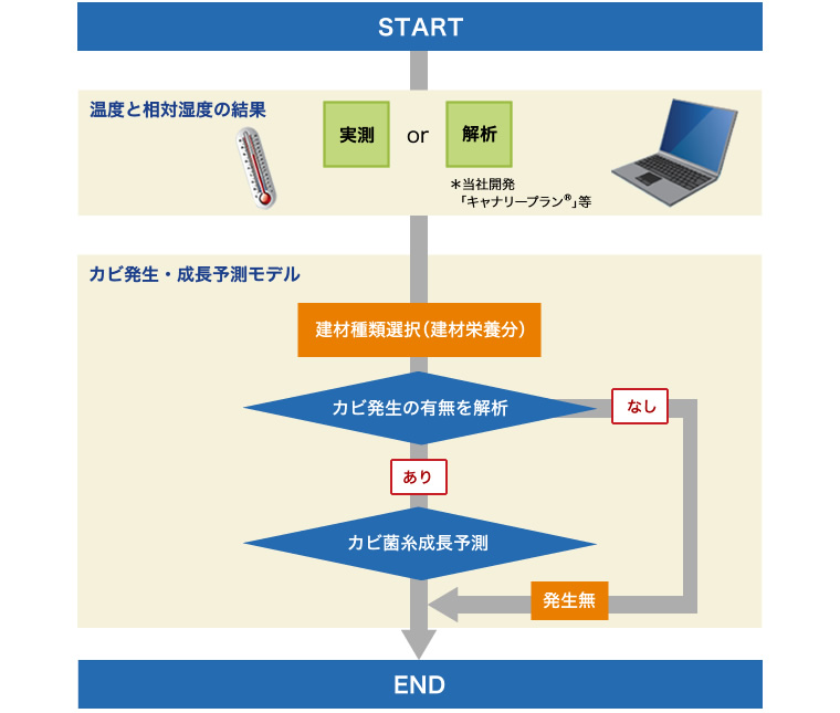 温湿度から、カビ胞子が発芽する発生段階と、その後カビ菌糸が成長する段階とを分けて評価することができます。対象となる場所の温湿度(実測値)、あるいは当社保有技術である「キャナリープラン®」で解析した温湿度(計算値)を本評価手法に入力するだけで、カビの発生や成長を予測でき、計画・設計といった初期段階におけるカビの予防対策が可能になります。
