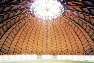 分節した木造吊り屋根が連続してワンウェイに懸架した集成材小梁がそのまま天井を形成するという、従来のドームにはない建築空間を作り出し、長手方向へのリニアな空間伸縮可変システムを組み入れた施設である。