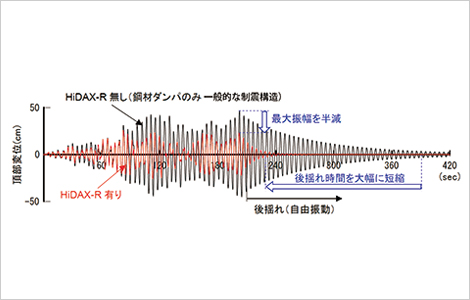 HiDAX-Rは、新開発の振動エネルギー回生システムVERS(Vibration Energy Recovery System)を搭載することで、その制震効率は従来型HiDAX-eの約2倍、一般型のオイルダンパの約4倍に達します。風揺れから震度7クラスの大地震までカバーすることはもちろん、頻度の高い震度4~5クラスの地震や、継続時間の長い長周期地震動に対して特に効果を発揮します。
